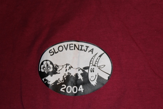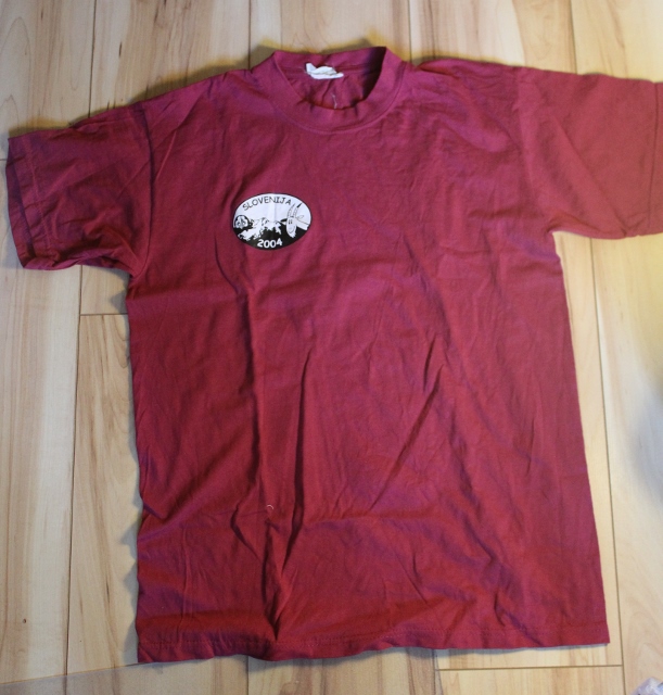Das rote Fahrten- T- Shirt aus Slowenien von 2004 ist ein normales T- Shirt, dass ein Aufdruck aus Slowenien auf der Brust hat. Das T- Shirt ist Unisex und trägt die Größe S. Wir verkaufen es für 7€.