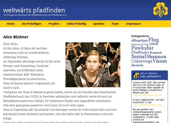 Alice, von Herbst 2009 bis Herbst 2011 Stammesführerin des Stammes Waldreiter, engagiert sich seit Anfang September 2011 beim Weltwärts-Projekt des BdP in Pawlodar in Kasachstan: weltwärts pfadfinden.