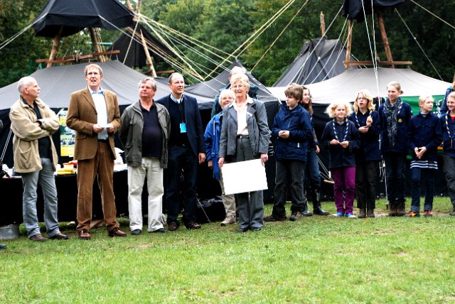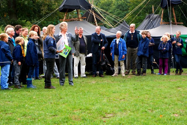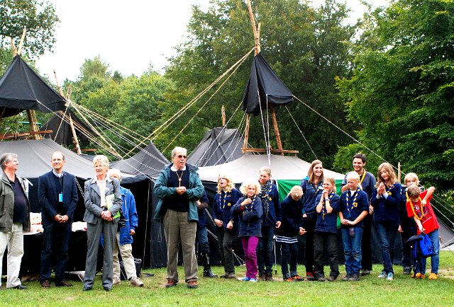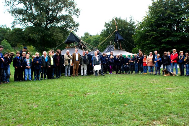 Gruppenfoto mit Ehrengästen: (v.l.) Anna Tessmer, Nadia Klaibor (stv. Stammesführerinnen), Karl-Wilhelm "Castor" Erxleben, Frau Christa Zeuke (Kreispräsidentin, Förderverein Jugendarbeit), Bürgermeister Janhinnerk Voß, Frau Buss, Uwe Sommer (Kreisjugendring), Axel Neumann (Landesvorsitzender des BdP) und Alice Büchner (Stammesführerin).