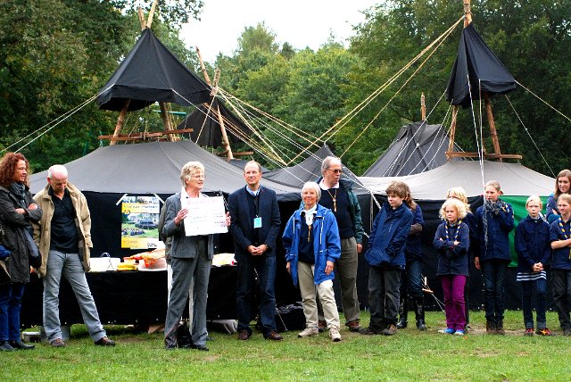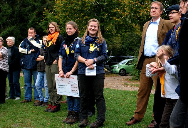 Fördervereins Jugendarbeit Stormarn einen Scheck für das Projekt des Stammes zum Jubiläum, die Erstellung einer umfangreichen Chronik in Form eines gedruckten Buches, an der viele Stammesmitglieder mitgewirkt haben.