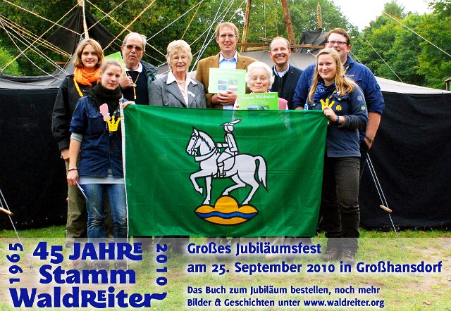 Unser Stamm wurde im Jahr 2010 45 Jahre alt! Das wurde mit einem großen Fest am 25. September gefeiert. Über 150 Gäste, darunter Stammesgründer Castor, die Kreispräsidentin Frau Zeuke, Herr Bürgermeister Voß, viele Ehemalige und Pfadfinderfreunde aus anderen Stämmen sowie Eltern und andere Besucher fanden sich auf der Wöhrendammwiese ein. Während des großen Festempfangs nahm Stammesführerin Alice von Castor, der 1965 den Stamm ins Leben rief, eine Kohte als Jubiläumsgeschenk entgegen. Kurze Grußworte vom Landesvorsitzenden, dem Bürgermeister, der Kreispräsidentin, Hulle vom Freundeskreis sowie von Stammesgründer Castor hoben die außergewöhnlichen Aktivitäten des Stammes hervor, der mit über 100 Mitgliedern einer der größten Stämme des BdP ist. Ein großes und buntes Festprogramm wartete auf die Gäste.
